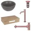 | Type | Waskom beton donkergrijs – koudwaterkraan hoog rood koper – inclusief wastafelplank licht eiken |